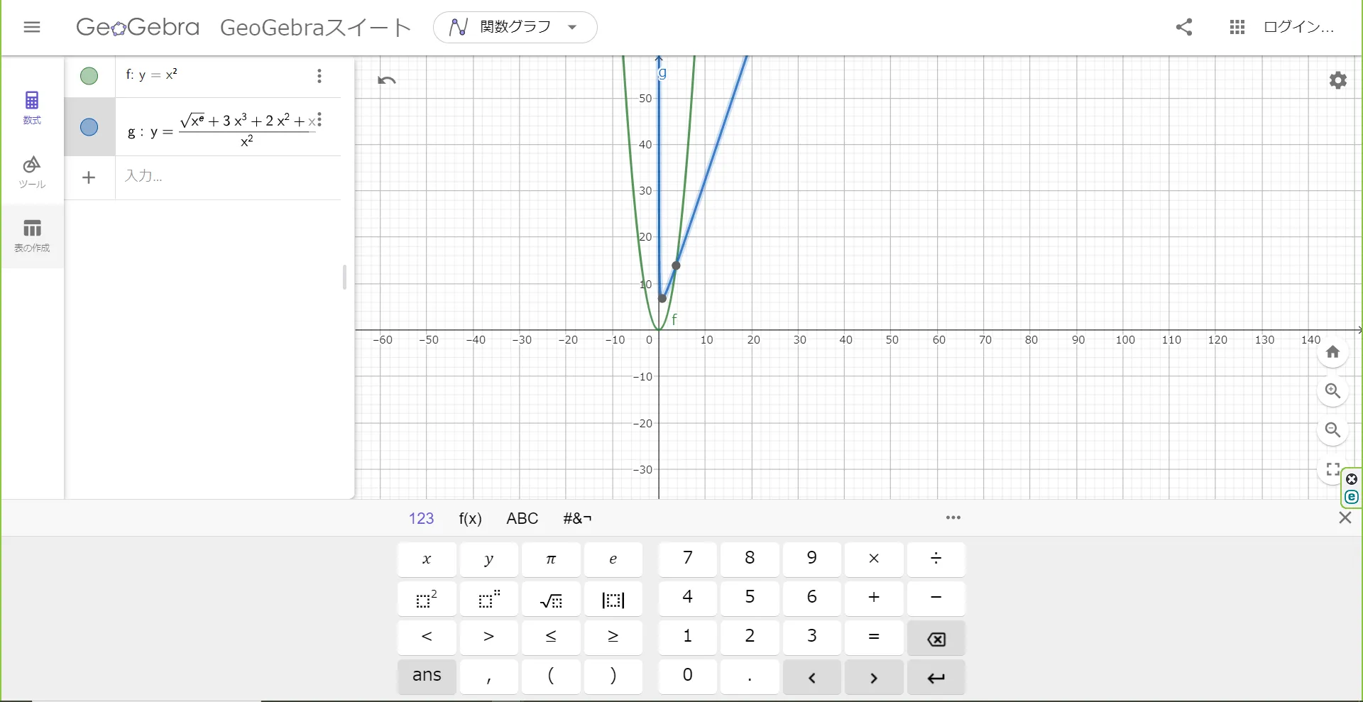 画面の下にキーボードが表示されるので,それを用いて表示したい数式を記入していきます.記入が終わると,画面にグラフが生成されます.複数のグラフを記入したい場合は,[入力]をクリックし,新しい数式を記入していくことで,新しいグラフを挿入できます.
