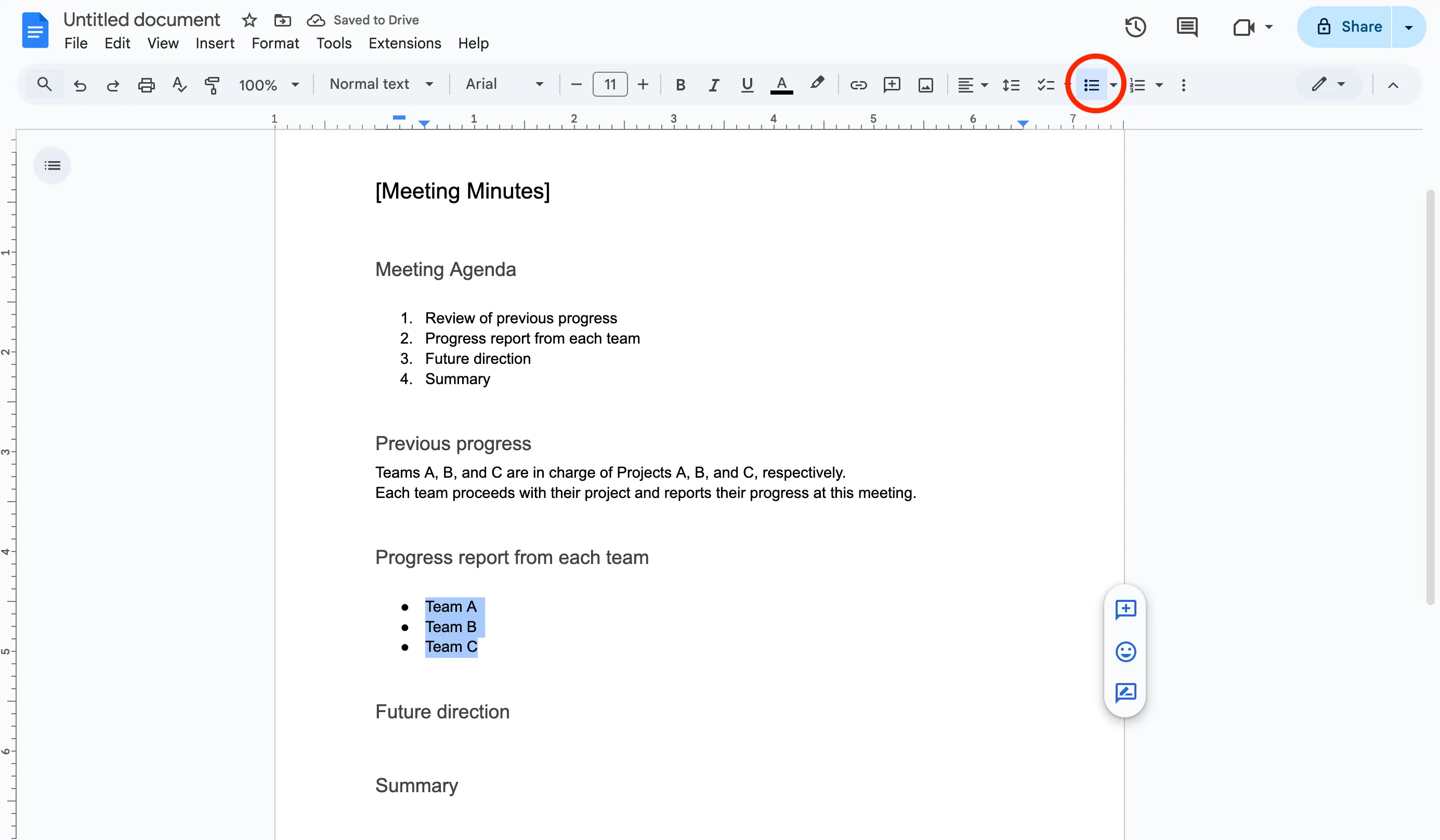 Alternatively, you can set a “Bulleted list” using the shortcut keys “Ctrl + Shift + 8” on Windows, or “Cmd + Shift + 8” on Mac.
