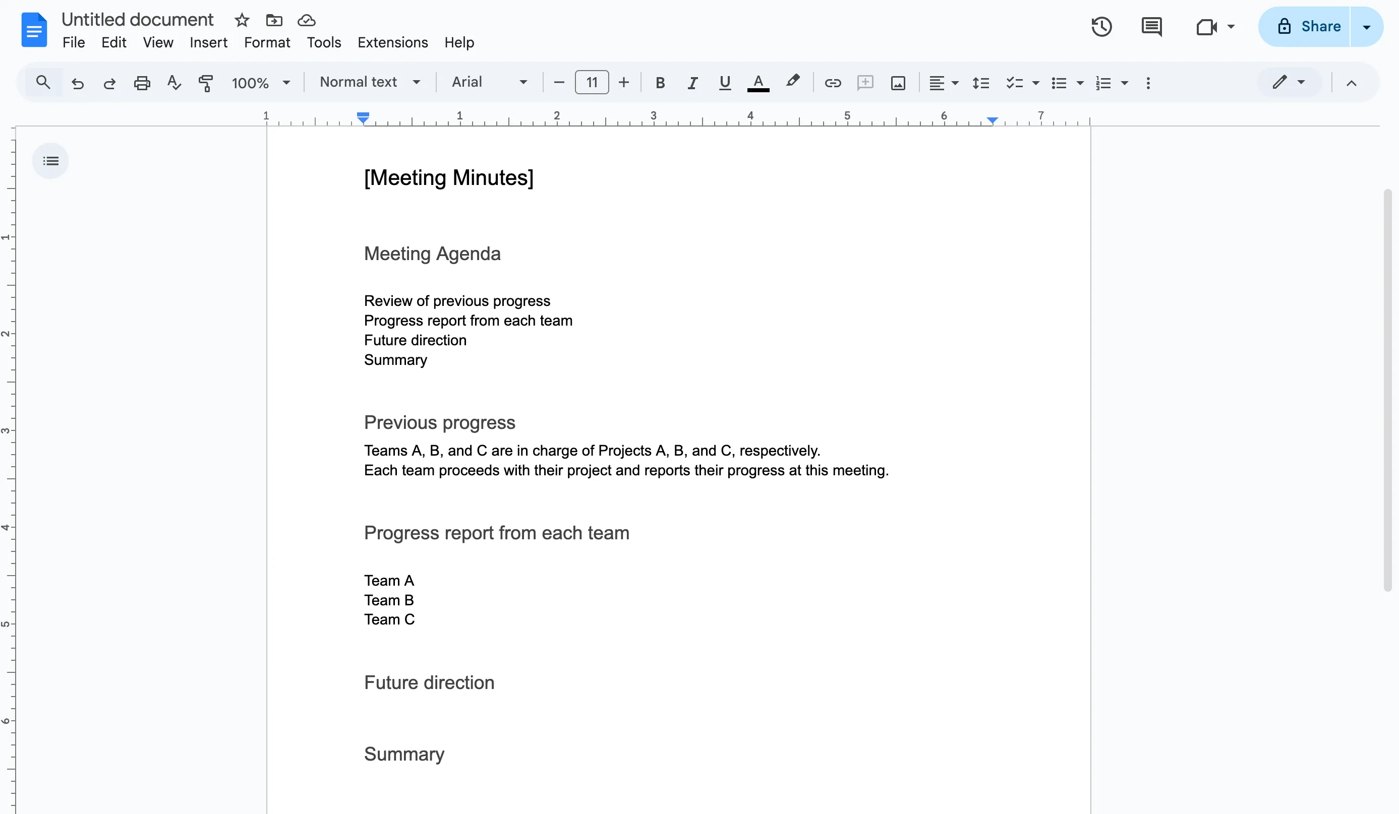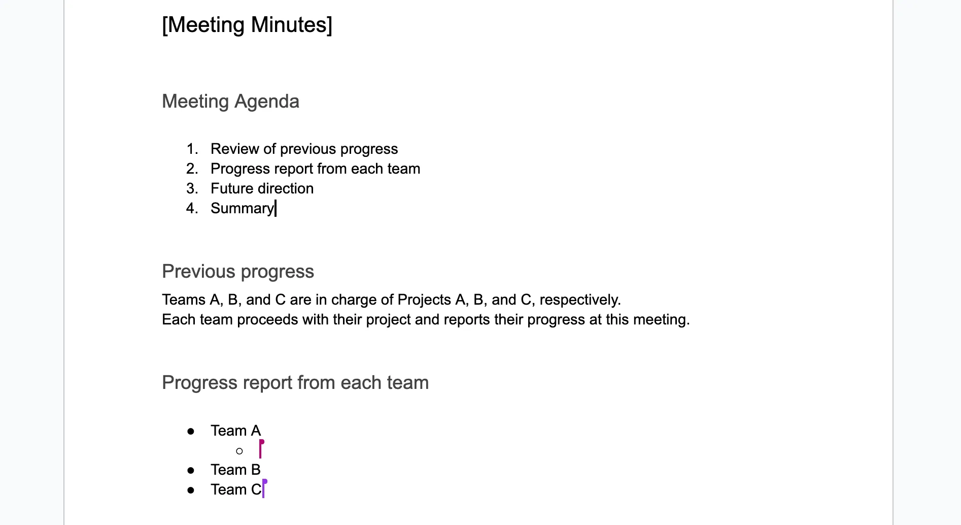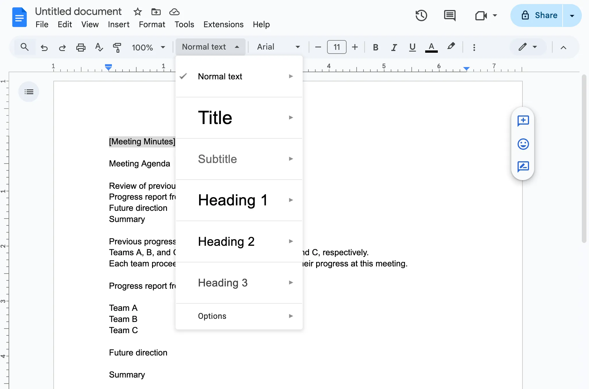 In the example above, “[Meeting Minutes]” is set to “Heading 2”, while “Meeting Agenda”, “Previous progress”, “Progress report from each team”, “Future direction”, and “Summary” are all set to “Heading 3”.