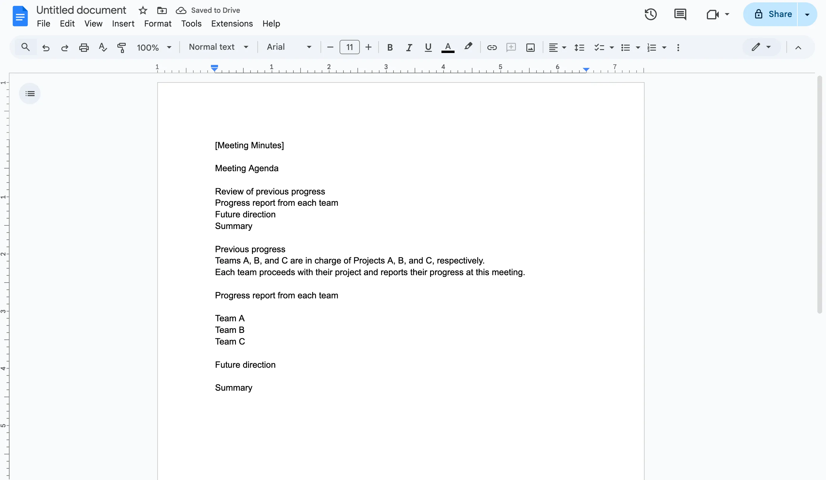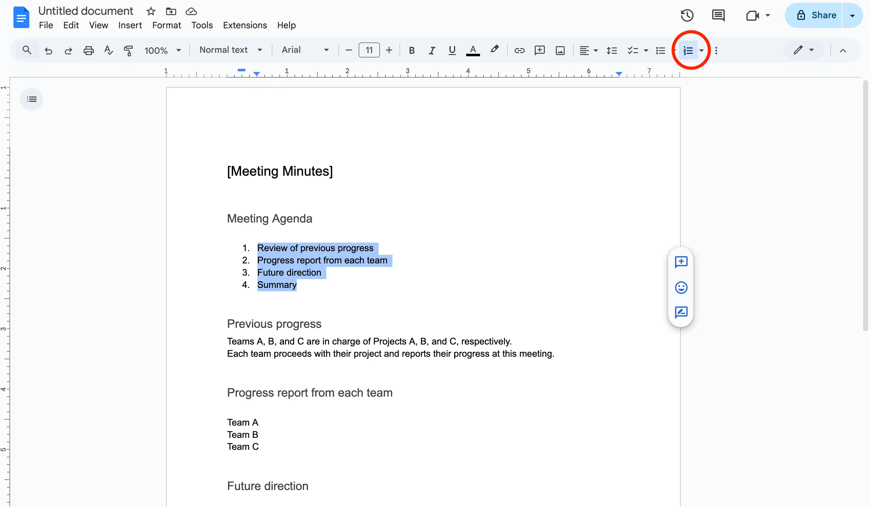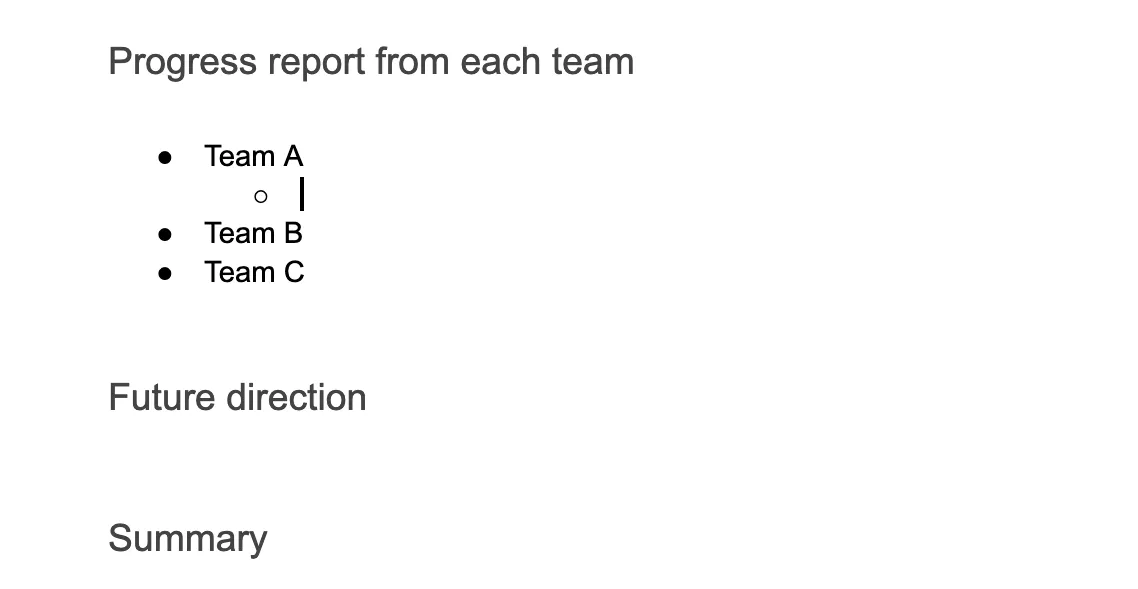 In the example above, “[Meeting Minutes]” is set to “Heading 2”, while “Meeting Agenda”, “Previous progress”, “Progress report from each team”, “Future direction”, and “Summary” are all set to “Heading 3”.