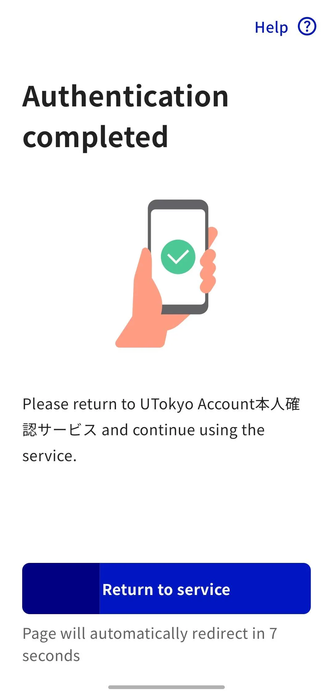 9. Tap “Return to the service in use” in the Digital Identification App or wait 10 seconds after the screen changes. You will be returned to the UTokyo Account Identity Verification Service.