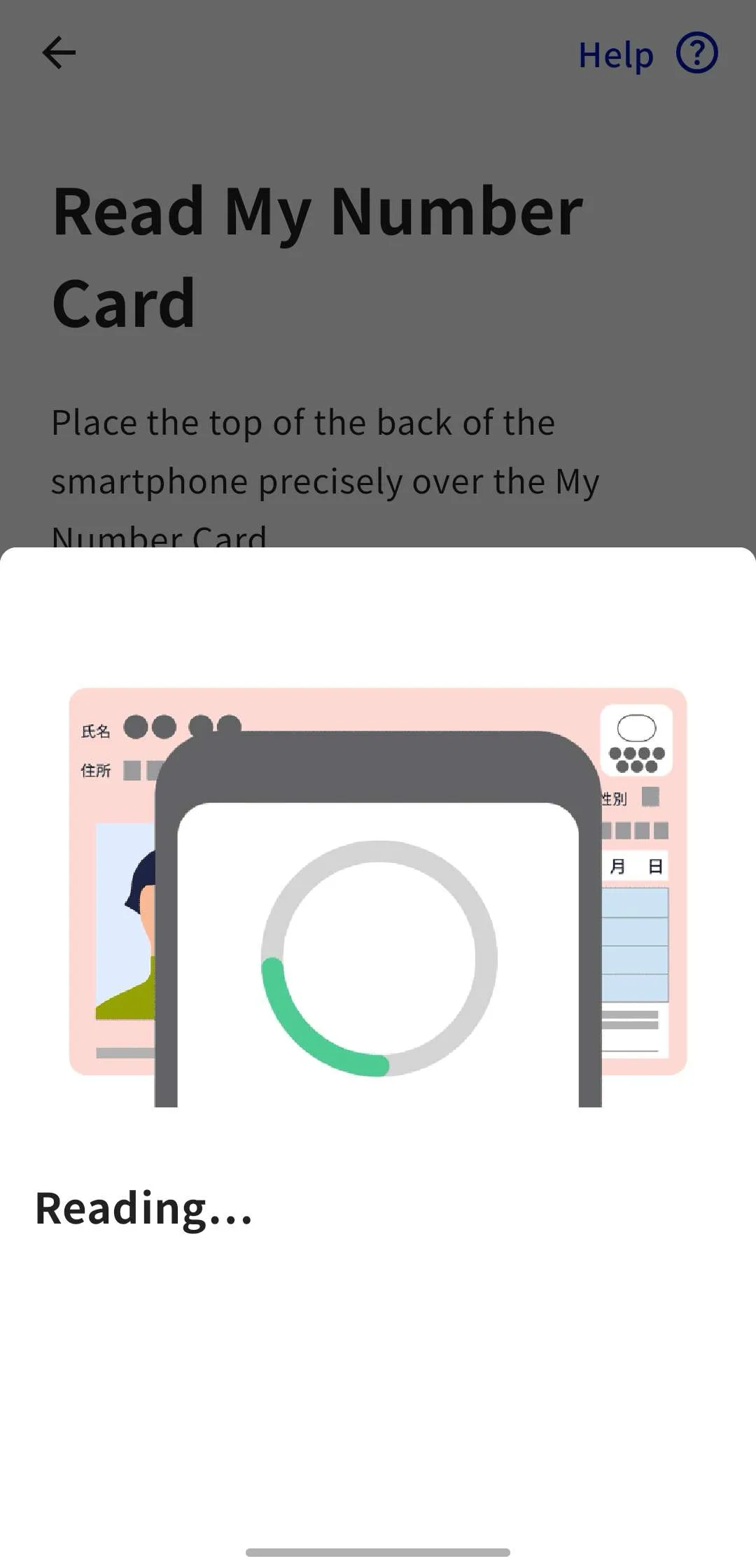 • While the message “Reading…” is displayed, do not move the My Number Card away from your smartphone.