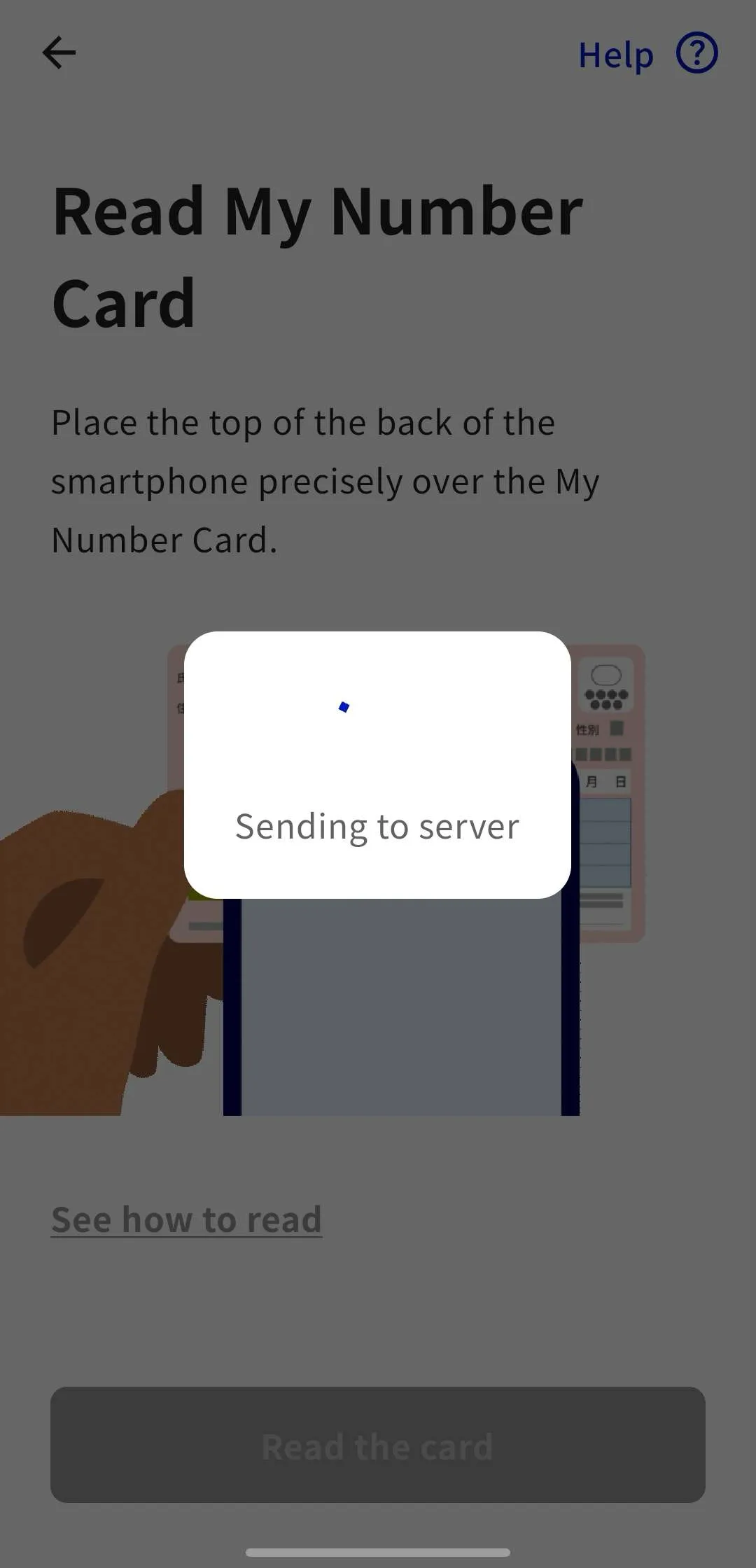 7. Follow the instructions in the app, tap the “Read the card” button, and scan your My Number Card with your smartphone.