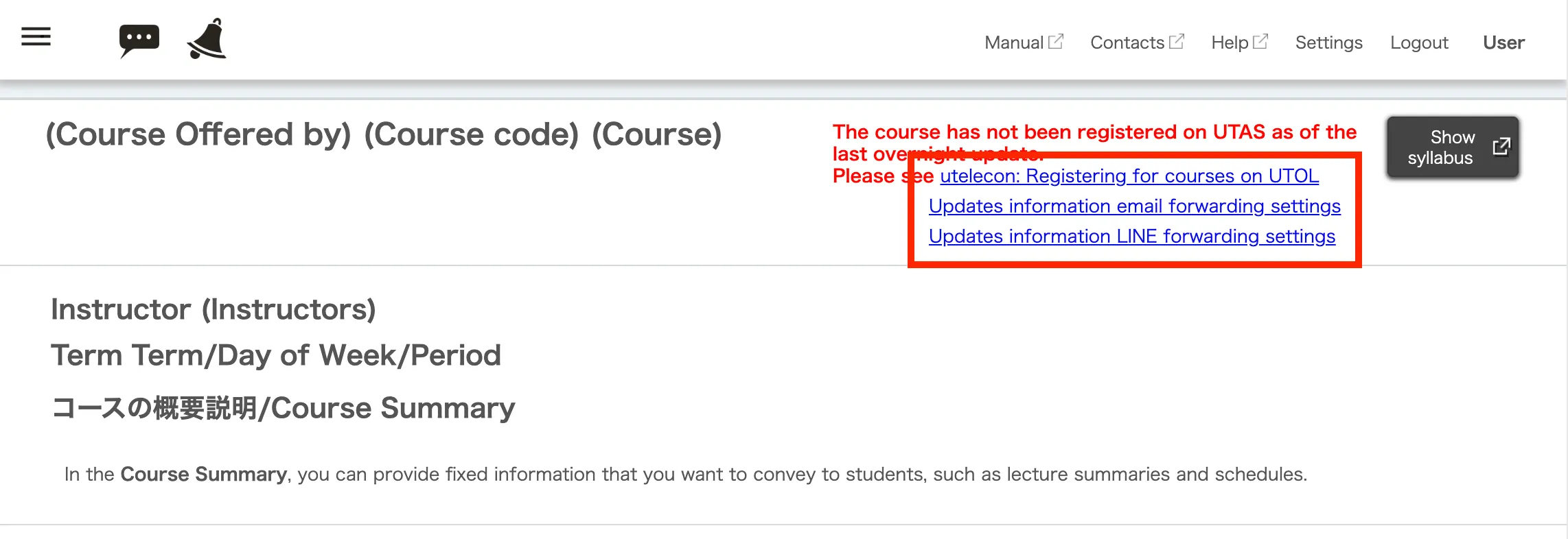 The following explains both the common (overall UTOL) settings and per-course notification settings.