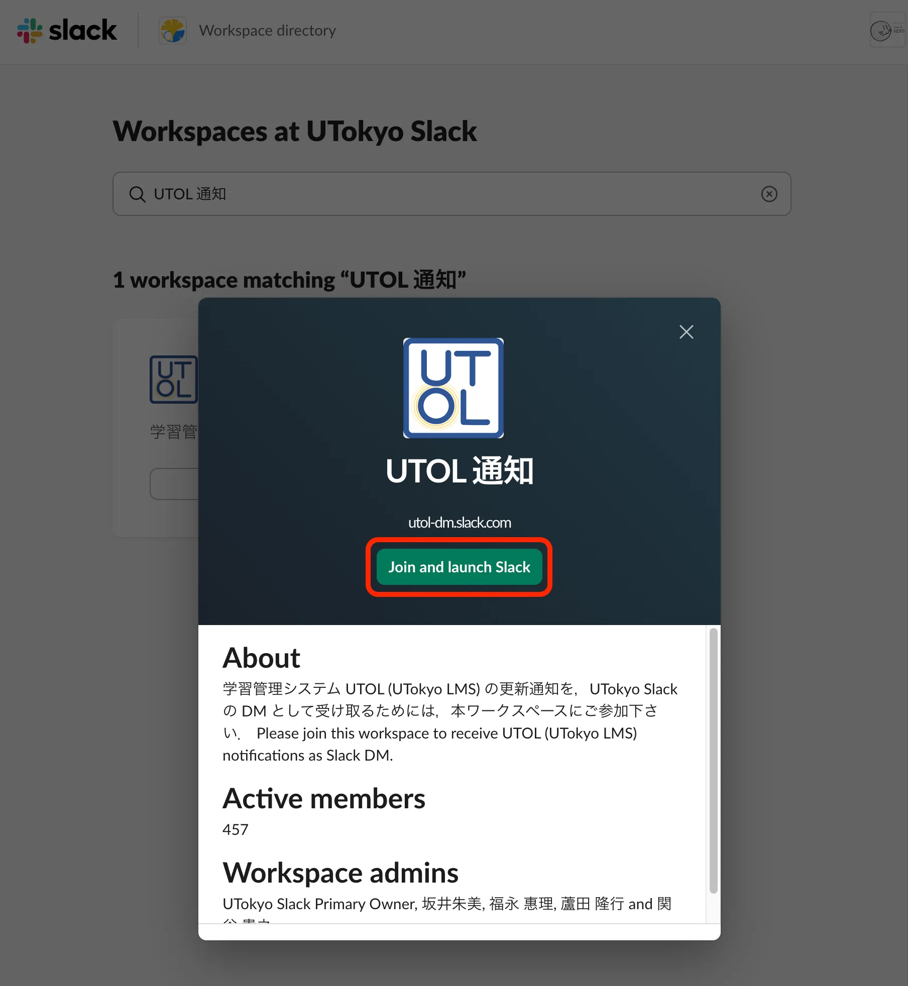 - Open the “Workspaces at UTokyo Slack” and follow Procedures 1 to 5 in Joining an open workspace in UTokyo Slack”.