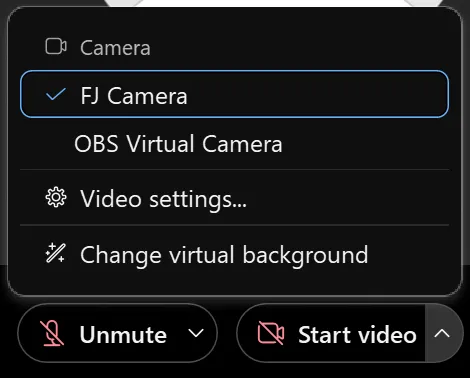 - Camera: Select the camera you want to use. (If you have any additional cameras attached to your device, you need to choose from among several options.) A preview of the camera will be displayed immediately below, so you can check the video feed.