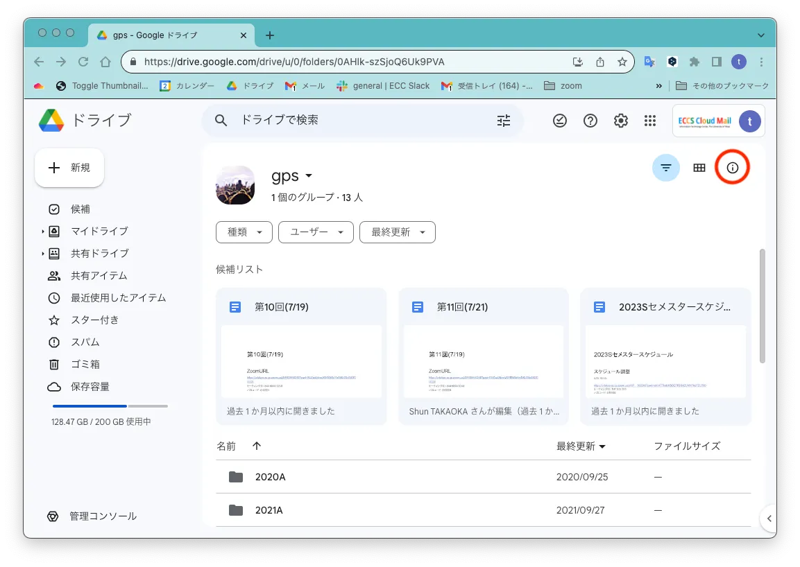- 共有ドライブの容量と使用量を確認するには,Googleドライブの共有ドライブ一覧から目的の共有ドライブを開き, 右の「詳細を表示」(「ⓘ」のアイコン)を押してください.
