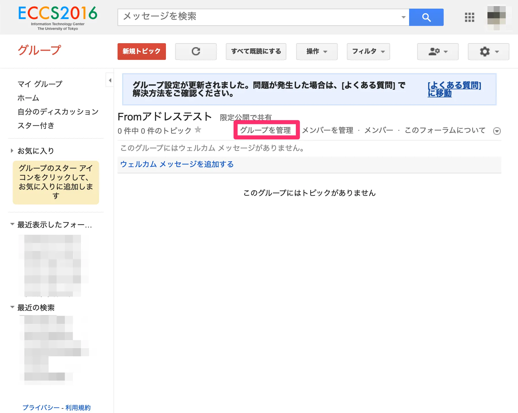 ECCSクラウドメール内で作成したGoogleグループをメーリングリストとして用いる際,そのメールアドレスを差出人としてメールを送信することが可能です.そのためには,事前に下記の手順のような設定が必要です.