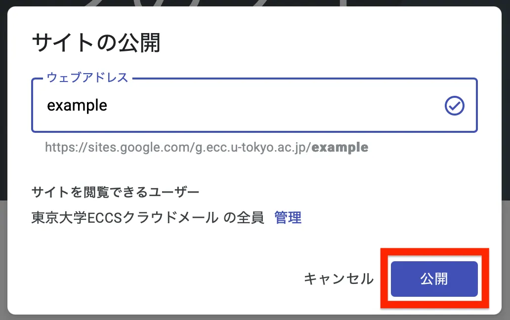 • 「東京大学ECCSクラウドメール」を選択した場合,ECCSクラウドメールのユーザーだけが閲覧できるようになります.大学構成員に公開範囲を限定したいときは,「東京大学ECCSクラウドメール」を選択してください.