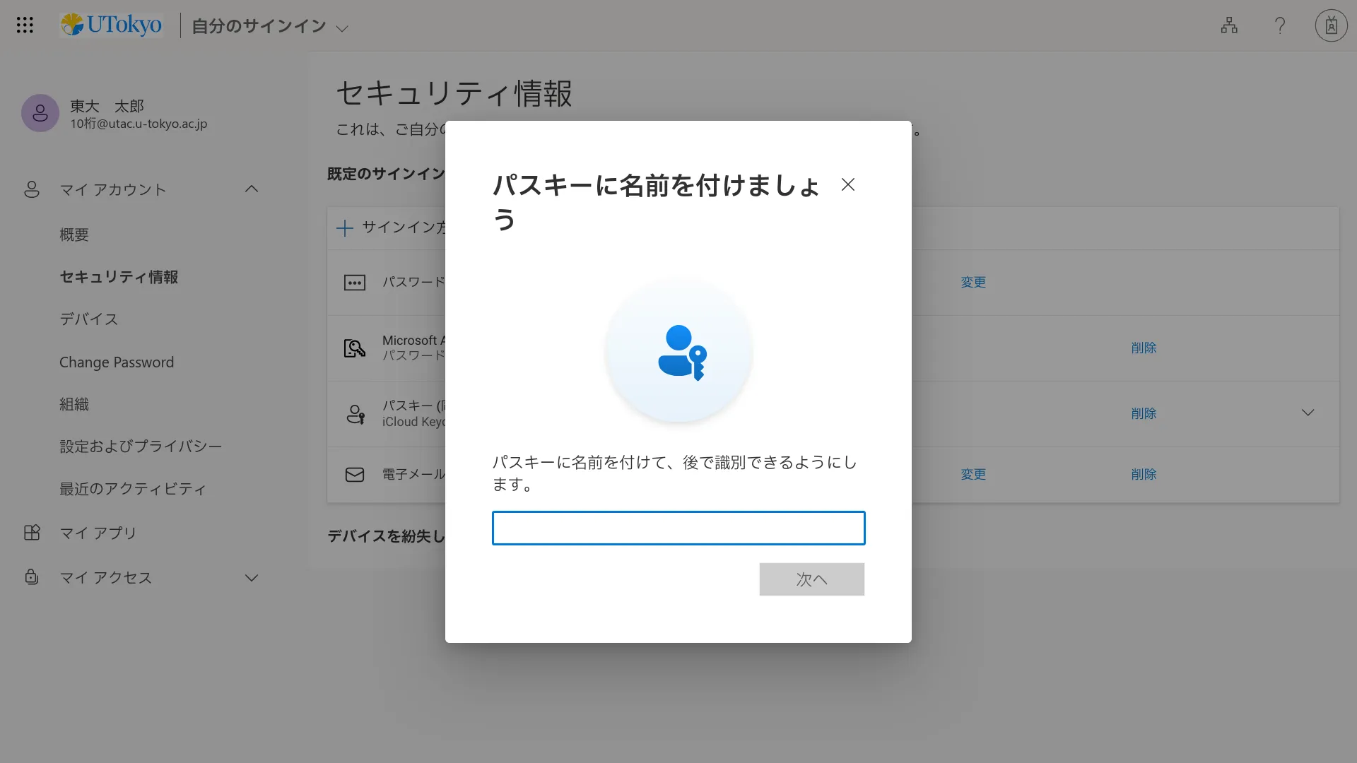 画面が遷移し,「パスキーを設定しています」という画面が表示されるので,「次へ」を押してください(自動で 6. に進むこともあります).