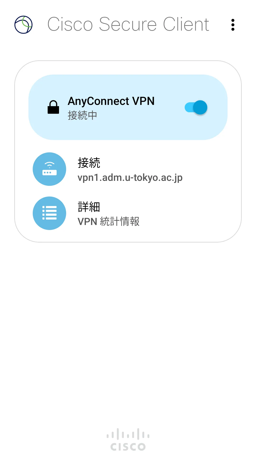 手順G: 以下のようにSecure Clientアプリの下に「接続中」と表示されていれば,お使いの機器はUTokyo VPNに接続している状態です.