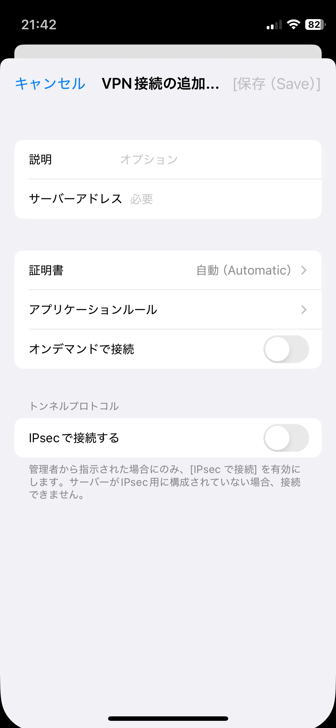 手順C: アプリを起動した直後の画面で「接続」をタップし,続いて表示される画面で「VPN接続の追加」をタップすると,以下のような画面が表示されます.「サーバーアドレス」の横の入力欄をタップして vpn1.adm.u-tokyo.ac.jp と入力します.