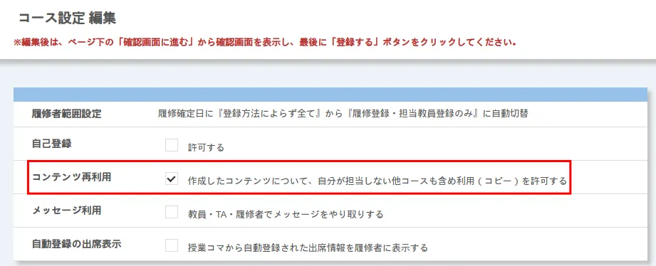 2. 「作成したコンテンツについて、自分が担当しない他コースも含め利用(コピー)を許可する」にチェックを入れてください.