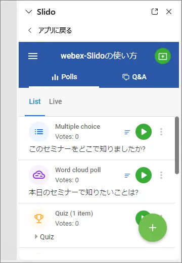 - 基本的な操作はウェブで実施するSlidoと同じ操作です.