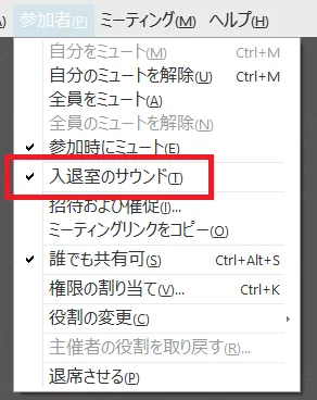 「参加者」メニューの「入退室のサウンド」で設定します.