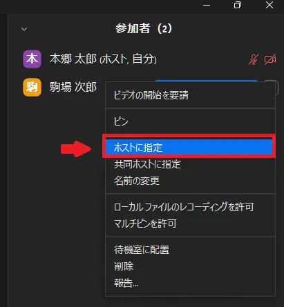 なお,必要が済んで共同ホストを解除する場合は,「共同ホスト権限を削除」を選択してください.