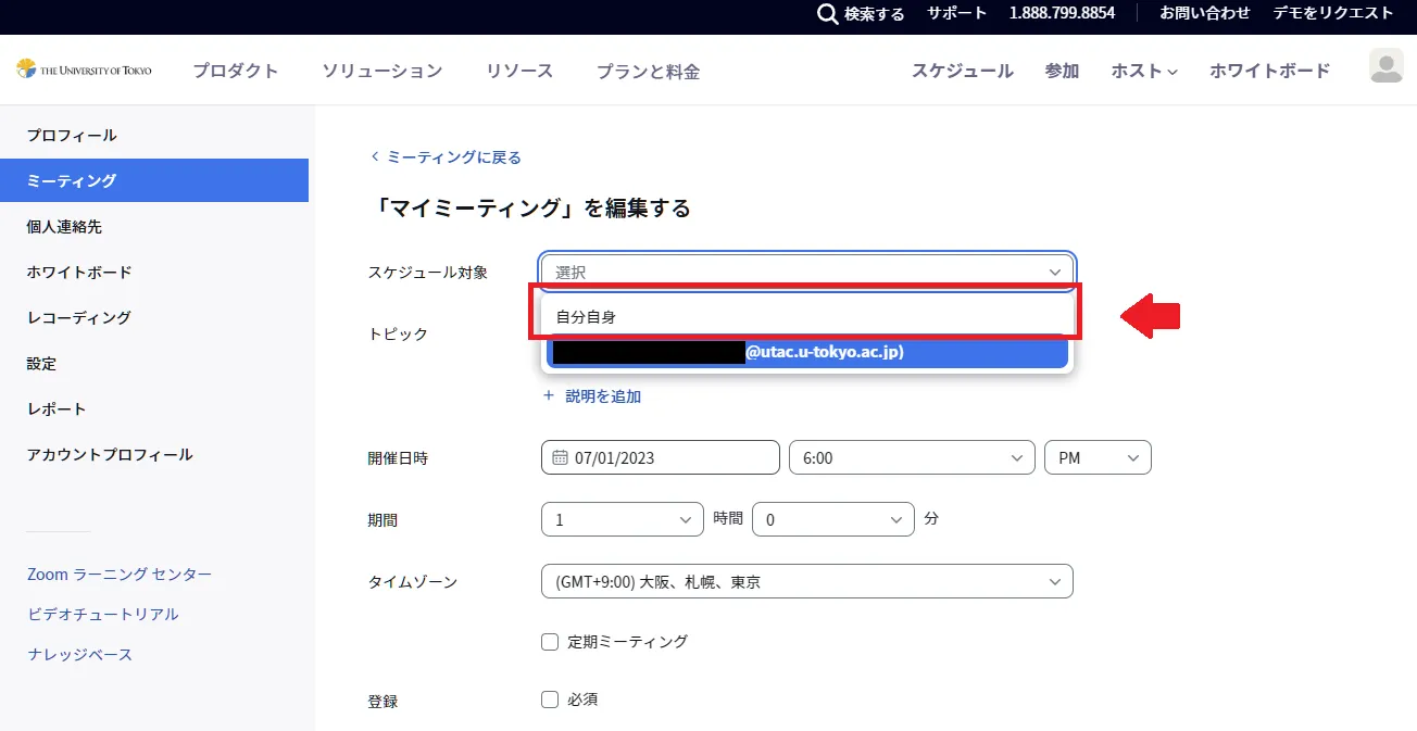 4. その後は通常通りにミーティングを編集してください.なお,この編集画面で「スケジュール対象」を「自分自身」に変更をすると,当該ミーティングを親ユーザーのものから子ユーザーのものにすることが可能です.