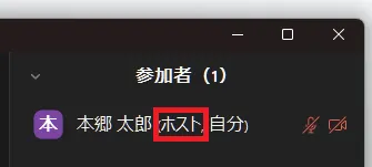 ホストとは,ミーティングの作成者に対して付与される役割のことです.一つのミーティングに対し,一人だけ存在します.ミーティング中に誰がホストになっているかを確認するには,ミーティング画面下部の「参加者」ボタンを選択してください. 表示された参加者の一覧のうち,ホストになっている参加者には名前の右側に「(ホスト)」の表示があります.