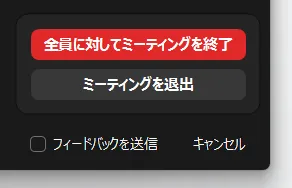 ホストが進行中のミーティングを退出する場合,以下のように「全員に対してミーティングを終了」と「ミーティングを退出」の2つの選択肢が表示されることがあります. これは,1つのミーティングに対しては原則として4常に1人のホストが存在している必要があるため,ホストがミーティングを退出する場合,ミーティング自体を終了させるか他の参加者にホストを移動させる必要があるために表示されているものです.