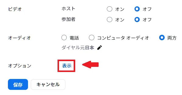 3. ミーティングのスケジュール・編集画面で「オプション」の項目の [表示] を選択してください.